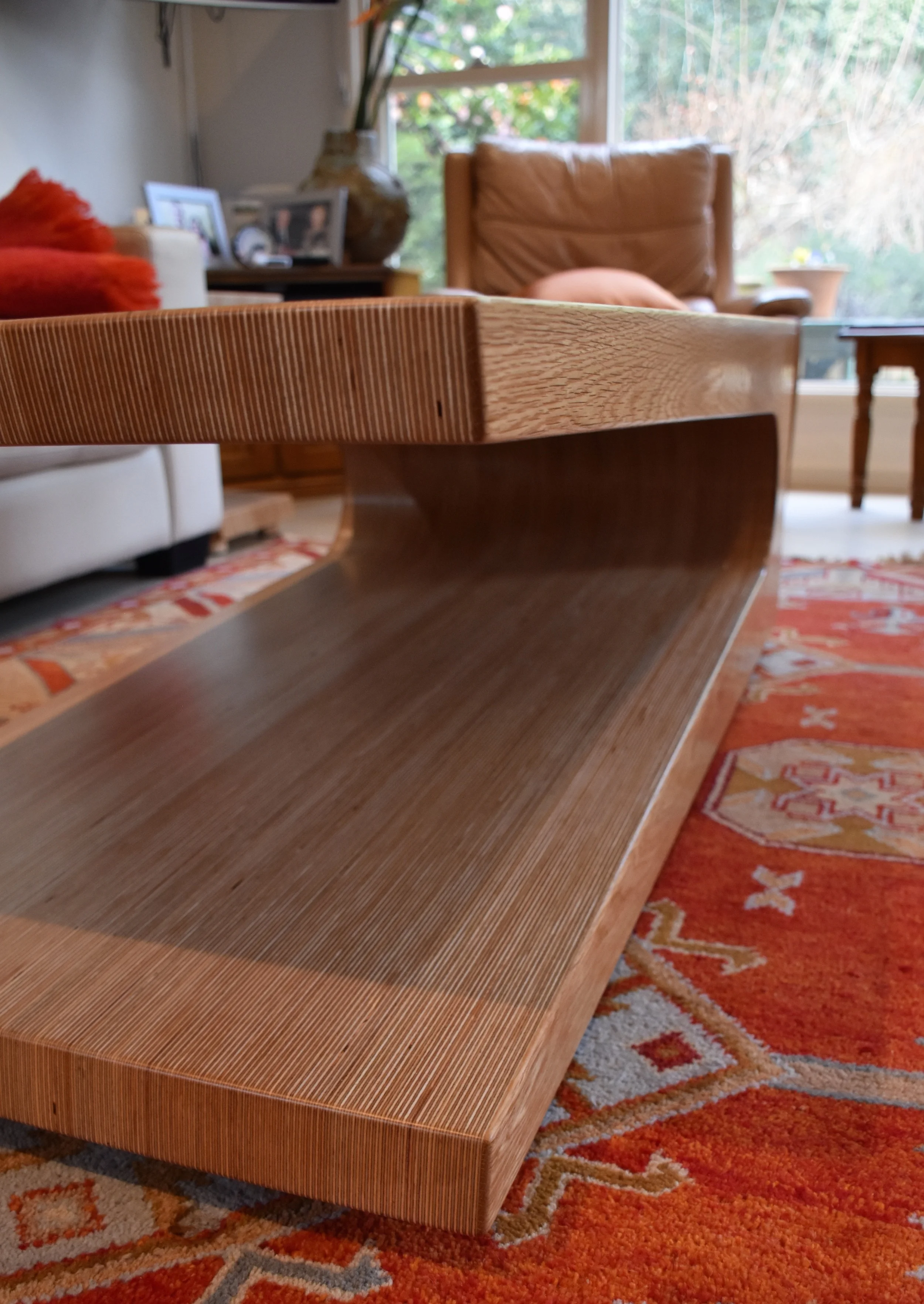 The cantilever design is an extension of the EACDESIGN sideboard. It's profile has been designed to fit within the proportions of a coffee table and side tables including feet. The feet make the coffee table and side tables look like they are floating from the ground and make them seem lighter than they actually are. The strength comes from existing tension within the ply, as well as two five millimetre thick laser cut mild steel plates which have been housed in the coffee table laminations.